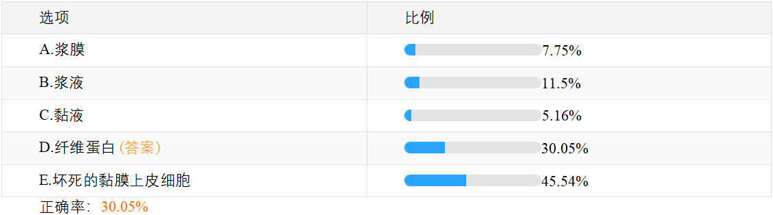 【正確率30.05%】假膜性炎滲出物中的特征成分是?