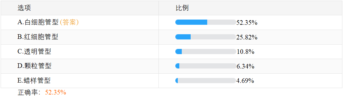 關于“臨床執(zhí)業(yè)醫(yī)師筆試摸底測試題:急性腎盂腎炎尿中最常見的管型?”,相信很多正在備戰(zhàn)2023年臨床執(zhí)業(yè)醫(yī)師考試的考生十分關注,此題在摸底測試50題(點擊參加測試>>)中正確率僅為52.35%,建議大家及時復習,牢固掌握相關知識點!