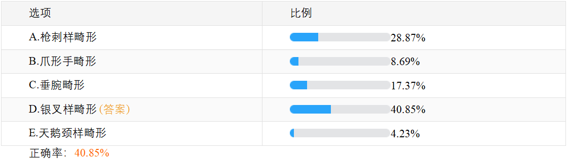 關于“橈骨遠端骨折時側面觀察的畸形表現(xiàn)是?”,相信很多正在備戰(zhàn)2023年臨床執(zhí)業(yè)醫(yī)師考試的考生十分關注,此題在摸底測試50題(點擊參加測試>>)中正確率僅為40.85%,建議大家及時復習,牢固掌握相關知識點!