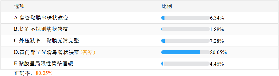 關(guān)于“關(guān)于賁門失弛緩癥的X線表現(xiàn)描述正確的是?”,相信很多正在備戰(zhàn)2023年臨床執(zhí)業(yè)醫(yī)師考試的考生十分關(guān)注,此題在摸底測試50題(點擊參加測試>>)中正確率僅為80.05%,建議大家及時復(fù)習(xí),牢固掌握相關(guān)知識點!