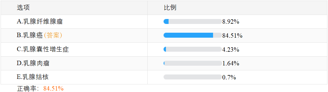 患者,女,55歲。1周前無意中發(fā)現(xiàn)右乳腺外上象限腫塊,大小約3cm×3cm×4cm,邊界不清,局部皮膚凹陷,右腋窩未觸及腫大淋巴結(jié)。
