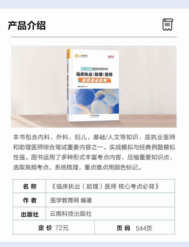 本書包含內(nèi)科,外科,婦兒,基礎(chǔ)/人文等知識,是執(zhí)業(yè)醫(yī)師和助理醫(yī)師綜合筆試重要內(nèi)容之一。實戰(zhàn)模擬與經(jīng)典例題模擬性強。圖書運用了多種形式豐富考點內(nèi)容,壓縮重要知識點,選取高頻考點,系統(tǒng)梳理,重點難點用顏色標(biāo)記。