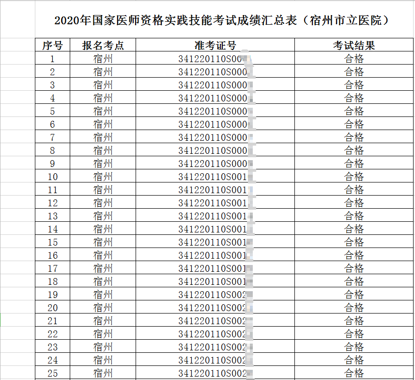 2020年國家醫(yī)師資格實踐技能考試成績匯總表(宿州市立醫(yī)院)