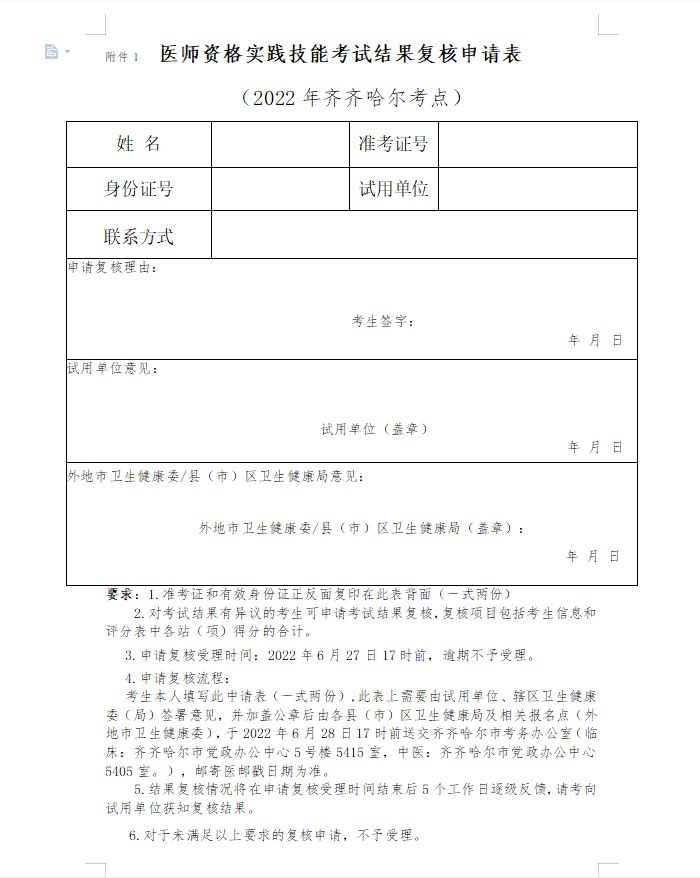 醫(yī)學教育網(wǎng)編輯為您整理了2022年醫(yī)師資格實踐技能考試齊齊哈爾考點結果復核申請表相關文件,具體內容如下,希望可以對您有所幫助: