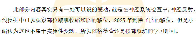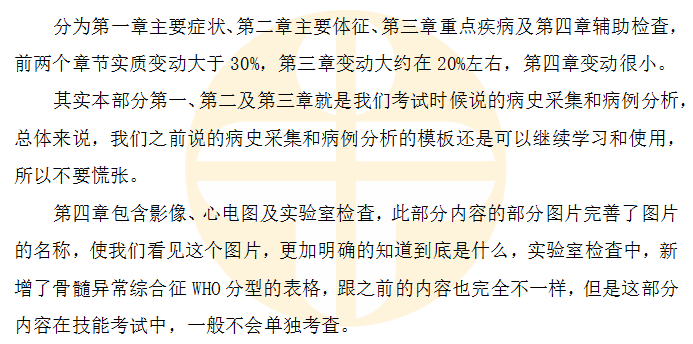 2025年臨床執(zhí)業(yè)醫(yī)師《實(shí)踐技能》教材新鮮出爐!經(jīng)過(guò)比對(duì)發(fā)現(xiàn),大綱與去年一樣,沒(méi)有變動(dòng),教材變動(dòng)非常大!總體變動(dòng)約30%。但是2025年臨床執(zhí)業(yè)醫(yī)師考生不要慌!因?yàn)闅v年的考試重點(diǎn)、難點(diǎn)目前還是考試高頻點(diǎn)。但是針對(duì)變化的內(nèi)容,我們?cè)趥淇紡?fù)習(xí)時(shí)要特別注意。按照往年考試規(guī)律,變動(dòng)內(nèi)容作為考試重點(diǎn)的幾率很高。