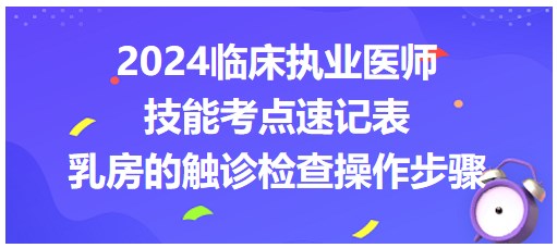 2024臨床執(zhí)業(yè)醫(yī)師考生請(qǐng)注意!實(shí)踐技能考試備考進(jìn)入倒計(jì)時(shí),一定堅(jiān)持每日備考復(fù)習(xí)加深考點(diǎn)記憶!正保醫(yī)學(xué)教育網(wǎng)幫考生整理了2024臨床執(zhí)業(yè)醫(yī)師技能考點(diǎn)表格速記-乳房的觸診檢查操作步驟,趕快來(lái)背!