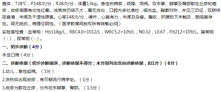 2020年臨床執(zhí)業(yè)醫(yī)師實踐技能考試手足口病病例分析診斷模板及評分標準