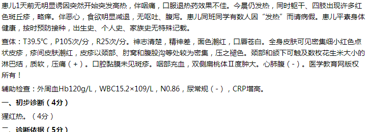 2.臨床表現(xiàn):1天前高熱,咽痛,軀干、四肢出現(xiàn)斑丘疹,略癢;(1分)