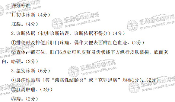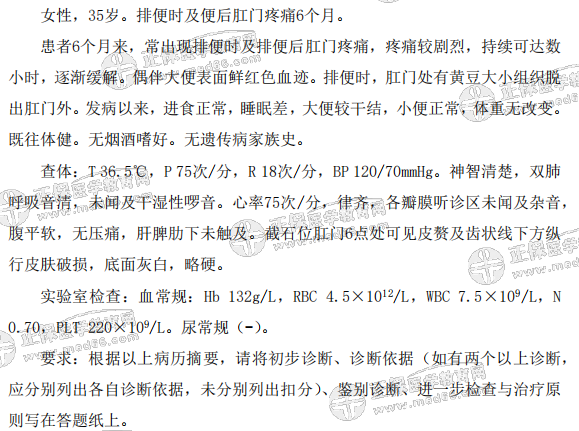 女性,35歲。排便時及便后肛門疼痛6個月...為了方便各位考生熟悉臨床執(zhí)業(yè)醫(yī)師實踐技能考試題型及出題方式,評分標準等,醫(yī)學(xué)教育網(wǎng)編輯為大家整理臨床執(zhí)業(yè)醫(yī)師實踐技能考試病例題,并附了詳細評分標準!可參考復(fù)習。
