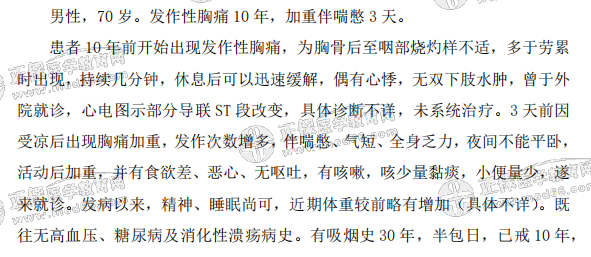 - · 男性,70歲。發(fā)作性胸痛10年,加重伴喘憋3天。