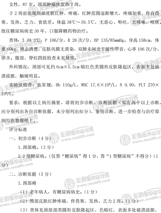 女性,87歲。頸部腫痛伴發(fā)熱2周...為了方便各位考生熟悉臨床執(zhí)業(yè)醫(yī)師實(shí)踐技能考試題型及出題方式,評(píng)分標(biāo)準(zhǔn)等,醫(yī)學(xué)教育網(wǎng)編輯為大家整理臨床執(zhí)業(yè)醫(yī)師實(shí)踐技能考試病例題,并附了詳細(xì)評(píng)分標(biāo)準(zhǔn)!可參考復(fù)習(xí)。