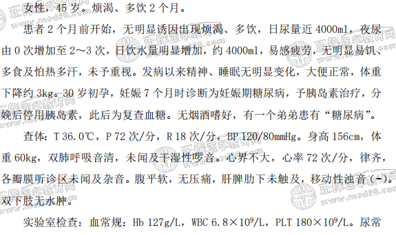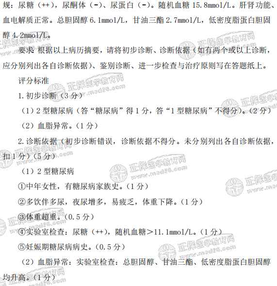 女性,45歲。煩渴、多飲2個(gè)月...為了方便各位考生熟悉臨床執(zhí)業(yè)醫(yī)師實(shí)踐技能考試題型及出題方式,評(píng)分標(biāo)準(zhǔn)等,醫(yī)學(xué)教育網(wǎng)編輯為大家整理臨床執(zhí)業(yè)醫(yī)師實(shí)踐技能考試病例題,并附了詳細(xì)評(píng)分標(biāo)準(zhǔn)!可參考復(fù)習(xí)。