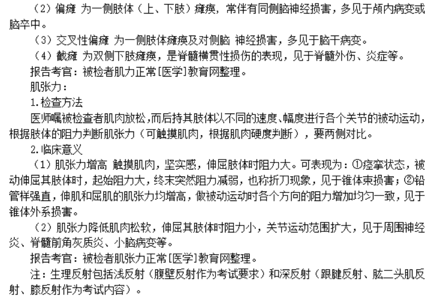 以上關于“肌力、肌張力操作步驟及注意事項——臨床醫(yī)師體格檢查歷年考點”的文章由醫(yī)學教育網編輯整理搜集,更多的文章隨時關注醫(yī)學教育網臨床執(zhí)業(yè)醫(yī)師實踐技能輔導精華欄目,醫(yī)學教育網也為廣大考生提供視頻講解,可以點擊這里了解班次>>