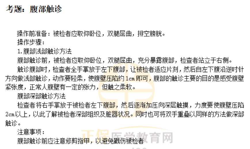 腹部淺部觸診方法及注意事項——臨床執(zhí)業(yè)醫(yī)師體格檢查歷年考點如下,實踐技能第二站體格檢查是考試難點之一,為了幫助廣大醫(yī)考生學習,醫(yī)學教育網老師專門總結了“體格檢查”歷年考點,預祝大家都能取得優(yōu)異成績: