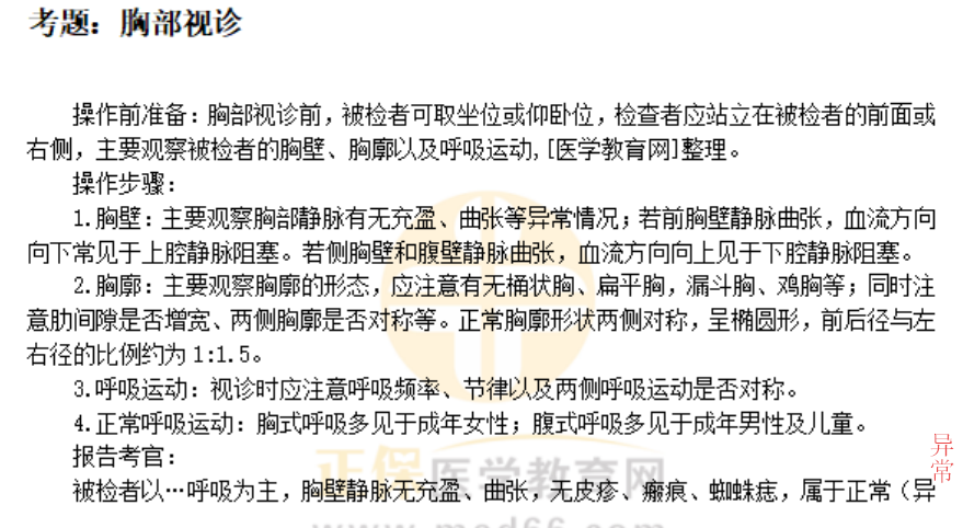 以上關(guān)于“臨床執(zhí)業(yè)醫(yī)師技能第二站體格檢查歷年考點(diǎn):胸部的視診”的文章由醫(yī)學(xué)教育網(wǎng)編輯整理搜集,更多的文章隨時(shí)關(guān)注醫(yī)學(xué)教育網(wǎng)臨床執(zhí)業(yè)醫(yī)師實(shí)踐技能輔導(dǎo)精華欄目,醫(yī)學(xué)教育網(wǎng)也為廣大考生提供視頻講解,可以點(diǎn)擊這里了解班次>>