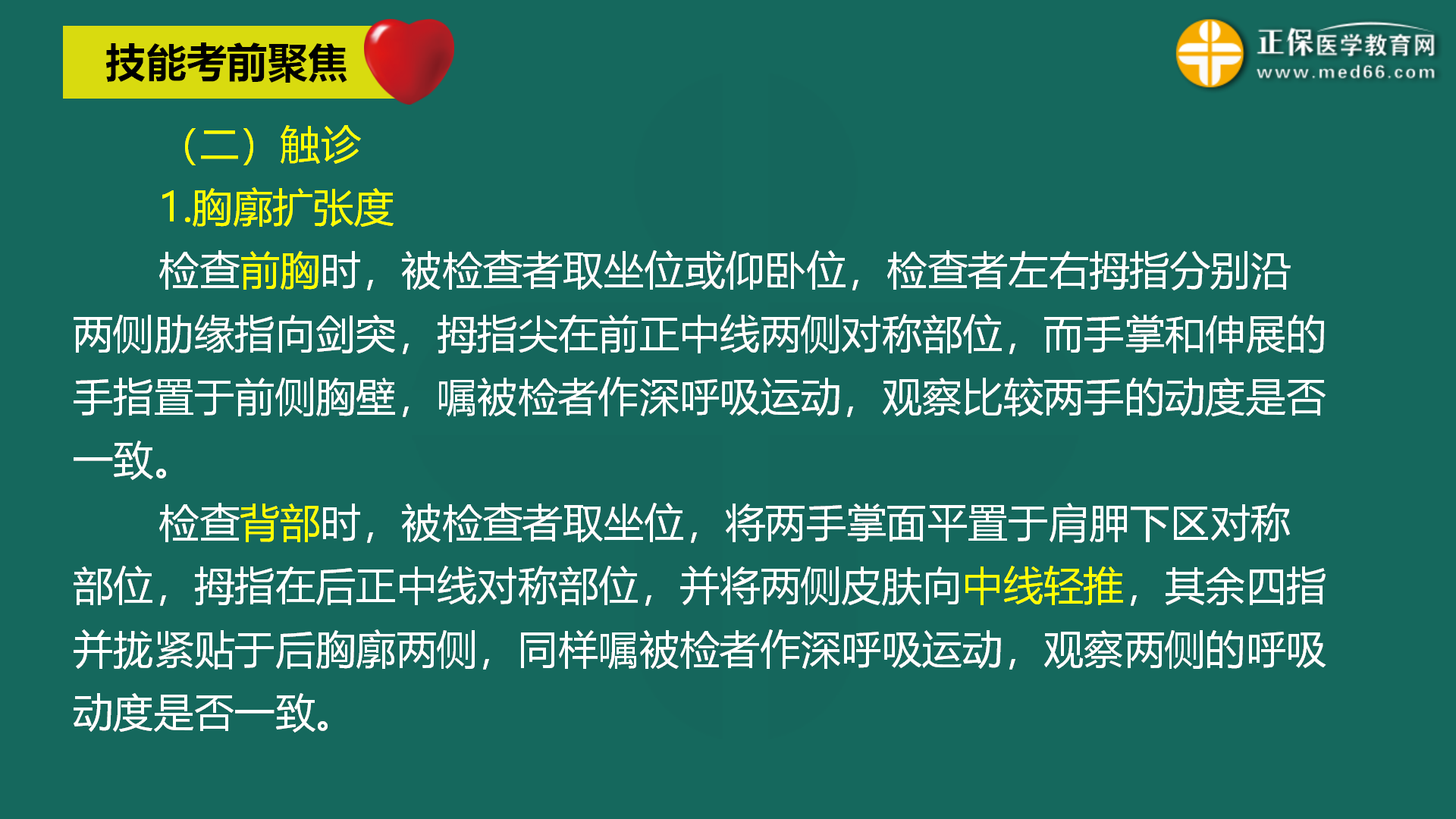 臨床實(shí)踐技能考前資料:觸診(胸廓擴(kuò)張度、語(yǔ)音震顫、胸膜摩擦感)
