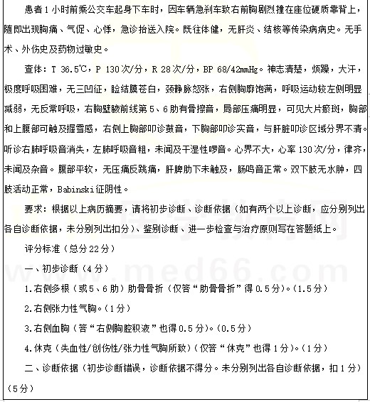 左側(cè)肋骨骨折、左側(cè)血氣胸、左側(cè)胸腔積液考點例題:女性,76歲。胸部外傷后疼痛、氣促、心悸1小時。2022年臨床醫(yī)師實踐技能考試正在進行中,醫(yī)學(xué)教育網(wǎng)編輯預(yù)祝各位考生順利參考,取得好成績!