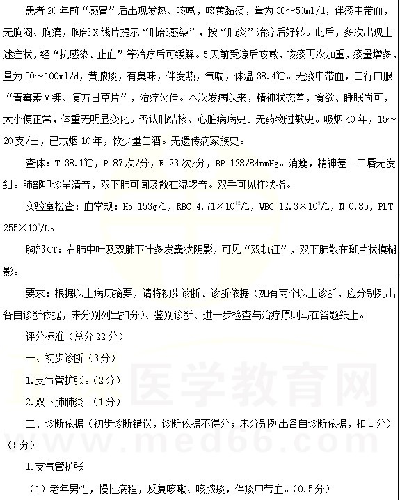 支氣管擴(kuò)張考點(diǎn)例題:男性,67歲。反復(fù)咳嗽、咳痰,痰中帶血20年,加重伴發(fā)熱5天。2022年臨床醫(yī)師實(shí)踐技能考試正在進(jìn)行中,醫(yī)學(xué)教育網(wǎng)編輯預(yù)祝各位考生順利參考,取得好成績(jī)!