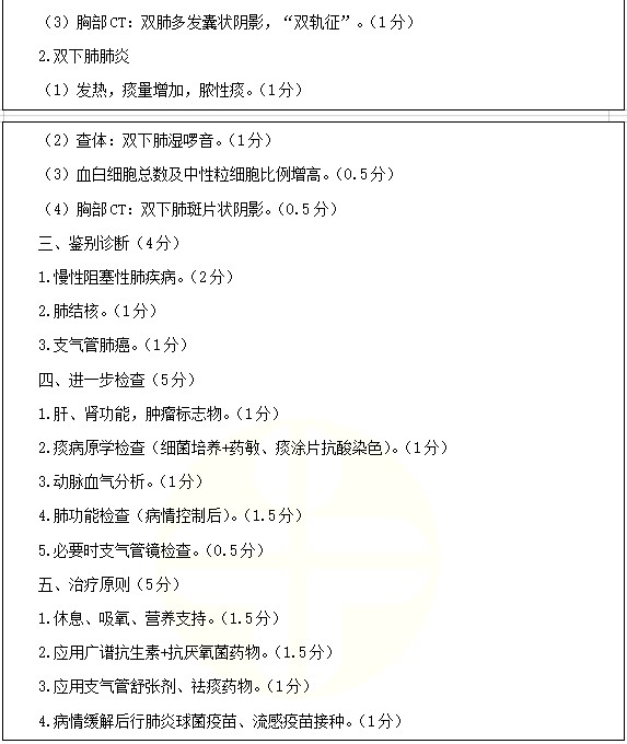 (2)查體:雙下肺濕啰音及干啰音,杵狀指。(0.5分)