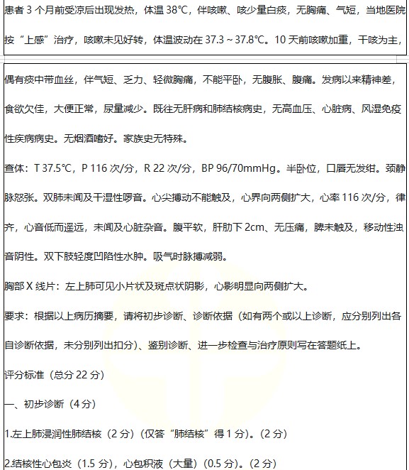 肺結(jié)核/結(jié)核性心包炎考點(diǎn)例題: 男性,29歲。咳嗽伴發(fā)熱3個月,加重伴氣短10天。2022年臨床醫(yī)師實(shí)踐技能考試正在進(jìn)行中,醫(yī)學(xué)教育網(wǎng)編輯預(yù)祝各位考生順利參考,取得好成績!