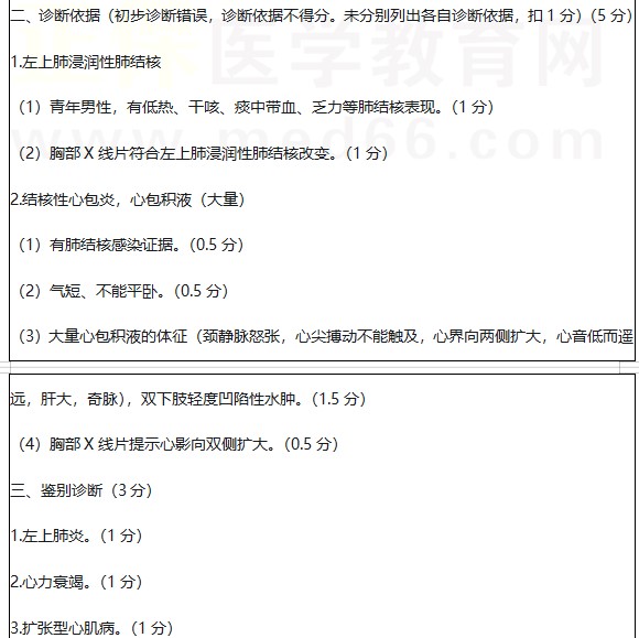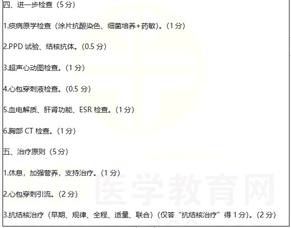 肺結(jié)核/結(jié)核性心包炎考點(diǎn)例題: 男性,29歲。咳嗽伴發(fā)熱3個月,加重伴氣短10天。