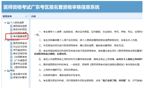一、考生登錄“醫(yī)師資格考試廣東考區(qū)報(bào)名暨資格審核信息系統(tǒng)” (https://jy.gdwsrc.net/),點(diǎn)擊“考試?yán)U費(fèi)信息”查看需繳費(fèi)信息。
