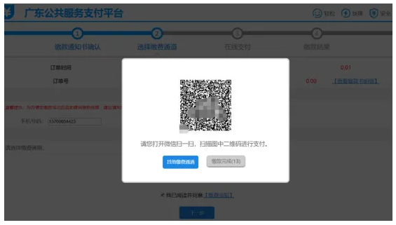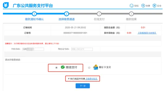 三、選擇繳費(fèi)通道,查看繳費(fèi)須知,選擇“我已閱讀并同意繳費(fèi)須知”,點(diǎn)擊“下一步”。