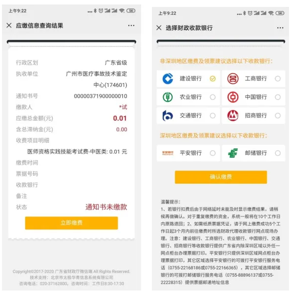 五、微信掃碼后,點(diǎn)擊“立即繳費(fèi)”,選擇“財(cái)政收款銀行”,注意區(qū)分非深圳地區(qū)和深圳地區(qū)。認(rèn)真閱讀“溫馨提示”。