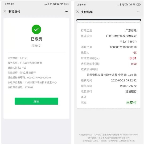 六、成功支付后,點(diǎn)擊“返回”,可以看到支付結(jié)果。