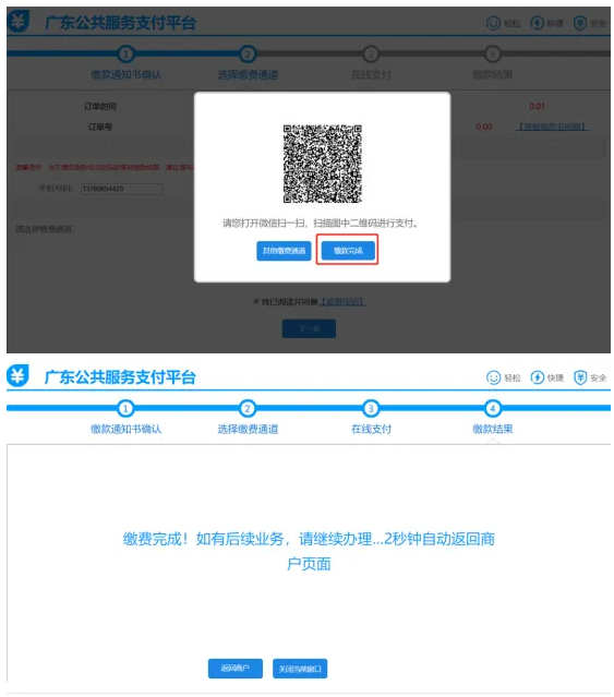 七、支付成功后,回到支付平臺(tái),點(diǎn)擊“繳款完成”,支付平臺(tái)自動(dòng)跳轉(zhuǎn)回系統(tǒng)的繳費(fèi)信息頁(yè)面。