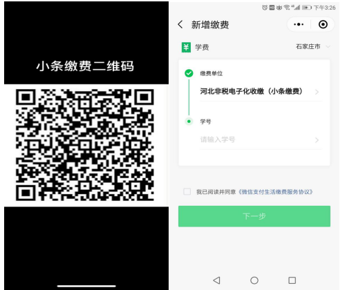 2、通過微信掃描“小條繳費(fèi)二維碼”,進(jìn)入以下繳費(fèi)界面,其中“學(xué)號”位置輸入“繳費(fèi)碼”,點(diǎn)擊“我已閱讀并同意”,再點(diǎn)擊“下一步”即可繳費(fèi)。