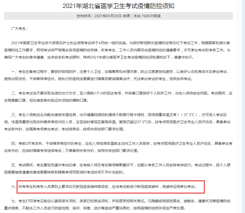 從各地區(qū)發(fā)布的考前提醒來(lái)看,多數(shù)地區(qū)都沒(méi)有要求考生打新冠疫苗,但是湖北考區(qū)在通知中提到:所有考生、考官合考務(wù)人員如無(wú)新冠疫苗接種禁忌癥,應(yīng)當(dāng)于考試前進(jìn)行新冠疫苗接種。