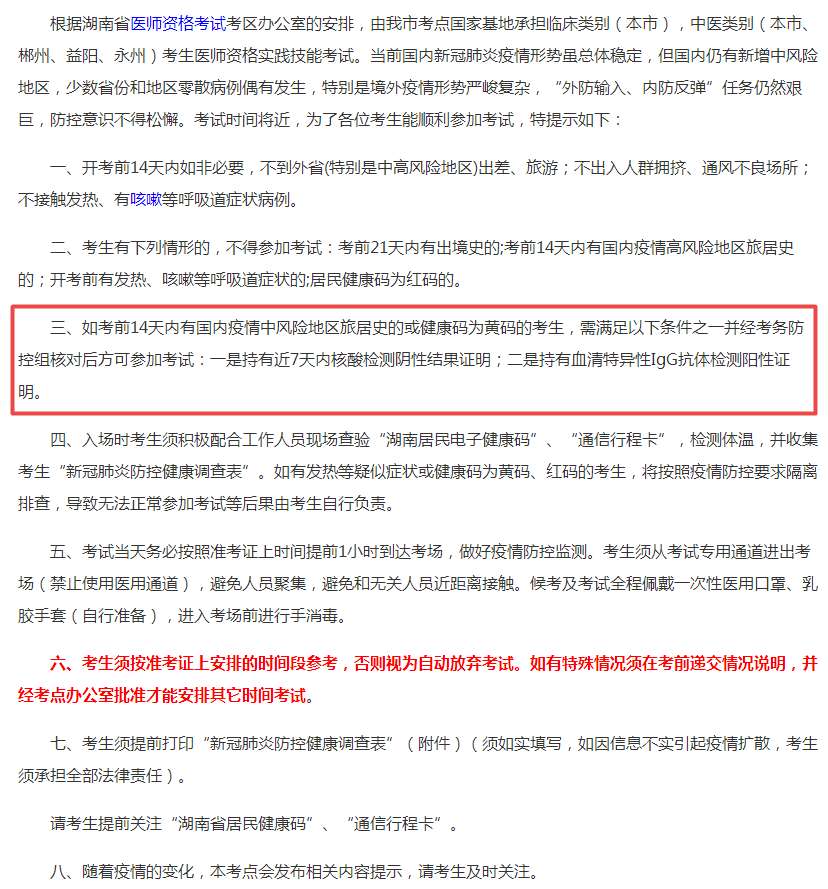 (三)來(lái)自中高風(fēng)險(xiǎn)地區(qū)和近期疫情發(fā)生地區(qū)的考生、通過(guò)國(guó)(境)外入境的考生,請(qǐng)第一時(shí)間主動(dòng)聯(lián)系考區(qū)或考點(diǎn),并報(bào)備具體行程,經(jīng)當(dāng)?shù)匾咔榉揽貙<医M評(píng)估解除風(fēng)險(xiǎn)后,方可申請(qǐng)參加考試。如有調(diào)整以本省發(fā)布的最新要求為準(zhǔn)。