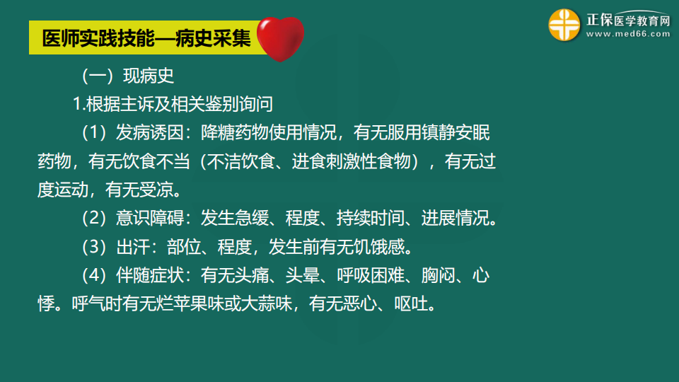 【答題模板】病史采集“意識障礙”關(guān)鍵詞:嗜睡、昏迷、狂躁、譫妄、神志不清,相信初次參加醫(yī)師資格考試的考生可能還不太清楚,醫(yī)學(xué)教育網(wǎng)章自立老師在近期免費直播課中有舉例講到“女性,50歲。因神志不清伴全身出汗半小時,家人送來急診就診。既往有“糖尿病”病史8年。”,錯過直播的同學(xué)可以看直播回放>>