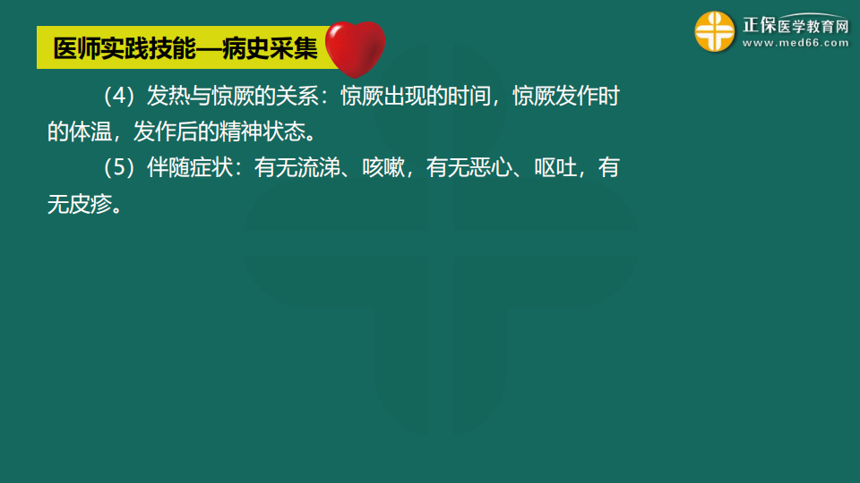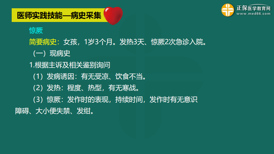 【病史采集驚厥答題模板】相信初次參加醫(yī)師資格考試的考生可能還不太清楚,醫(yī)學(xué)教育網(wǎng)章自立老師在近期免費(fèi)直播課中有舉例講到“女孩,1歲3個(gè)月。發(fā)熱3天、驚厥2次急診入院。”,錯(cuò)過直播的同學(xué)可以看直播回放>>