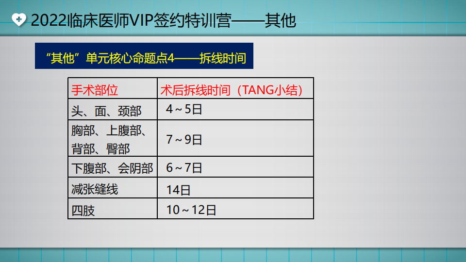 術(shù)后拆線時間——臨床醫(yī)師《其他》單元核心出題點(湯以恒講義)