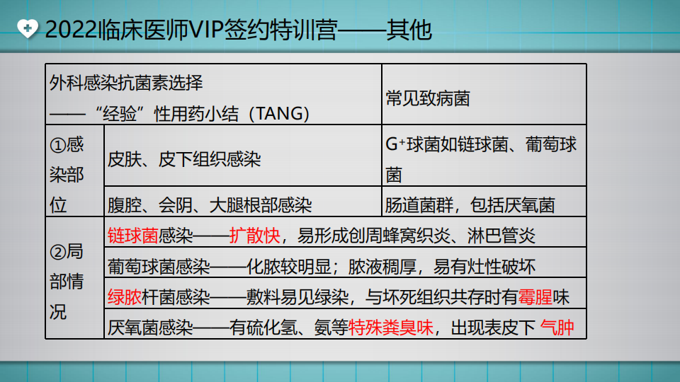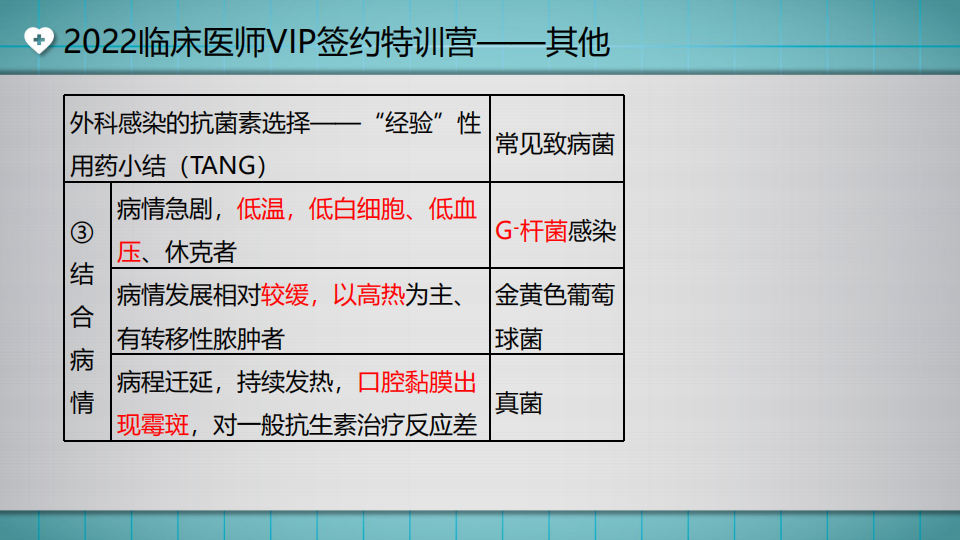 外科感染抗菌素選擇——“經(jīng)驗(yàn)”性用藥小結(jié)(TANG)如下,湯以恒老師4月25日開展了VIP強(qiáng)化特訓(xùn)公開課,參與直播的同學(xué)熱情高漲,都是干貨,全是精髓! 錯(cuò)過直播的同學(xué)可以看直播回放>>,現(xiàn)在將精彩講義內(nèi)容摘取如下,沒有參加直播的同學(xué),也可以一睹為快啦!