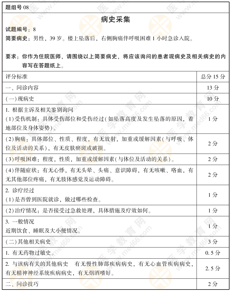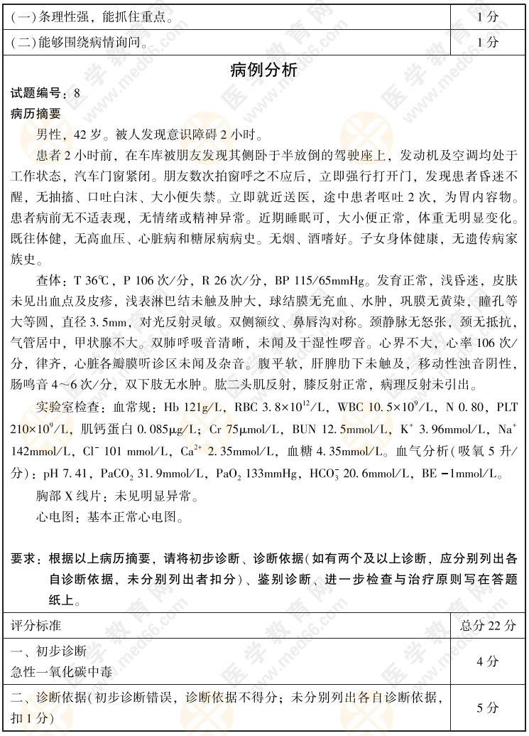 2022年臨床醫(yī)師病史采集+病例分析考前模擬卷第8套(含評(píng)分標(biāo)準(zhǔn))如下,2022年臨床執(zhí)業(yè)醫(yī)師實(shí)踐技能考試在即,醫(yī)學(xué)教育網(wǎng)整理了實(shí)踐技能考前指導(dǎo)手冊(cè)(查看活動(dòng)詳情>>),包含技能各站精選模擬試題,查看2022年臨床執(zhí)業(yè)醫(yī)師技能集訓(xùn)營(yíng),暢享考前直播課>>