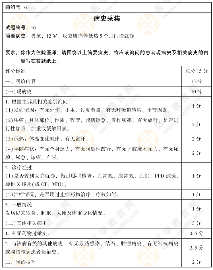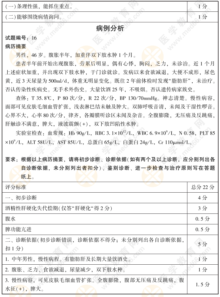 2022年臨床醫(yī)師病史采集+病例分析考前模擬卷第16套(含評分標準)