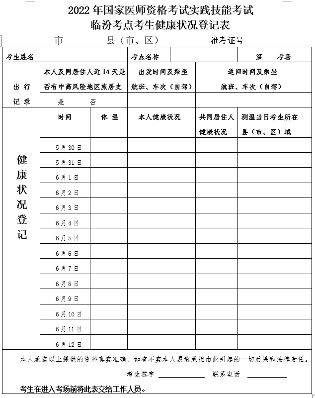 2022年國家醫(yī)師資格考試實踐技能考試臨汾考點考生健康狀況登記表下載