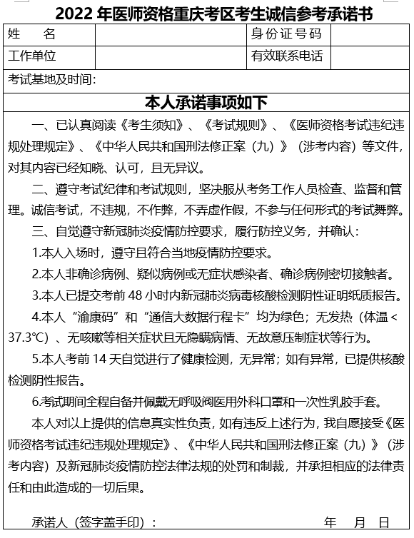 2022年醫(yī)師資格重慶考區(qū)考生實(shí)踐技能考試誠(chéng)信參考承諾書下載