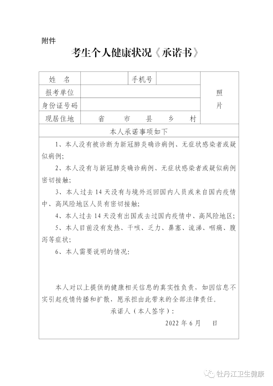 牡丹江考點(diǎn)2022年醫(yī)師資格考試考生個(gè)人健康狀況《承諾書(shū)》范文