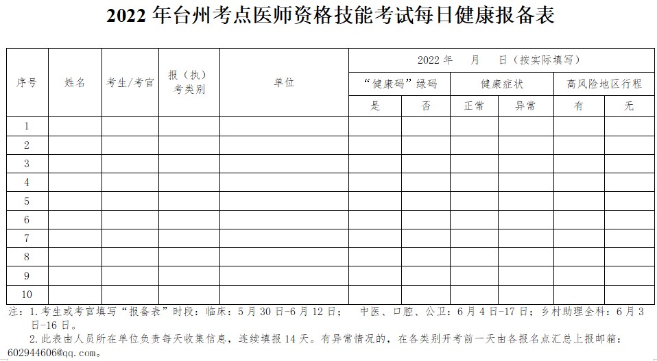 2022年臺州考點醫(yī)師資格技能考試每日健康報備表