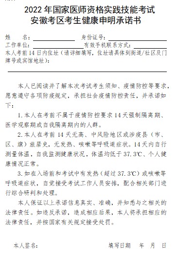2022年全國醫(yī)師資格實(shí)踐技能考試安徽考區(qū)考生健康申明承諾書如下,醫(yī)學(xué)教育網(wǎng)編輯為您整理。