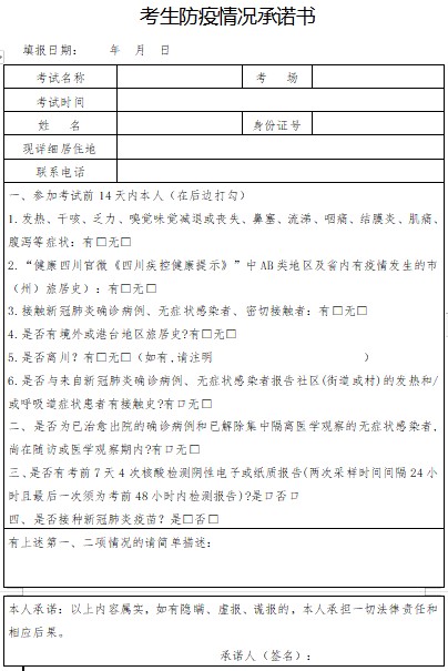 雅安考點2022年醫(yī)師資格考試實踐技能考試考生防疫情況承諾書如下,醫(yī)學教育網(wǎng)編輯為您整理。