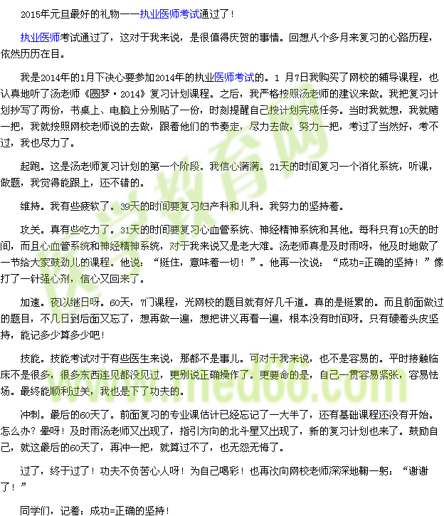 編者按:在2014年我的醫(yī)考之路大型征文活動(dòng)中,醫(yī)學(xué)教育網(wǎng)學(xué)員積極參與,為我們帶來了很多精彩的文章,執(zhí)業(yè)醫(yī)師考試學(xué)員段宗娥(學(xué)員代碼:dzedjz),根據(jù)自己參加2014年執(zhí)業(yè)醫(yī)師考試的經(jīng)歷寫了這篇:《我的醫(yī)考之路--成功=正確的堅(jiān)持!》,此篇文章在征文比賽中獲得了三等獎(jiǎng)的好成績,讓我們一起來分享他的經(jīng)驗(yàn)吧!