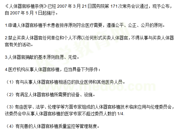 關(guān)于“臨床執(zhí)業(yè)醫(yī)師考試衛(wèi)生法規(guī)考點(diǎn):人體器官移植條例”相關(guān)信息,相信參加臨床執(zhí)業(yè)醫(yī)師考試的考生都在關(guān)注,為方便大家了解,在此醫(yī)學(xué)教育網(wǎng)小編為大家整理如下內(nèi)容: