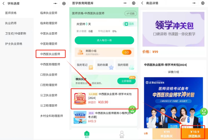 2、點擊“切換”-“醫(yī)師資格”,選擇報考類別,進入類別頁面下滑到底部選擇“領(lǐng)學沖關(guān)包”,3人團,到手低至6.9元!