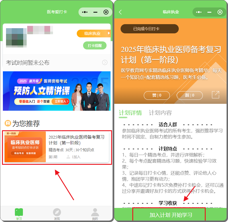 請(qǐng)選擇“您的備考計(jì)劃”,如中西醫(yī)執(zhí)業(yè)醫(yī)師備考復(fù)習(xí)計(jì)劃(第一階段),然后點(diǎn)擊下方“加入計(jì)劃開(kāi)始學(xué)習(xí)”按鈕,開(kāi)始正式進(jìn)入打卡學(xué)習(xí);