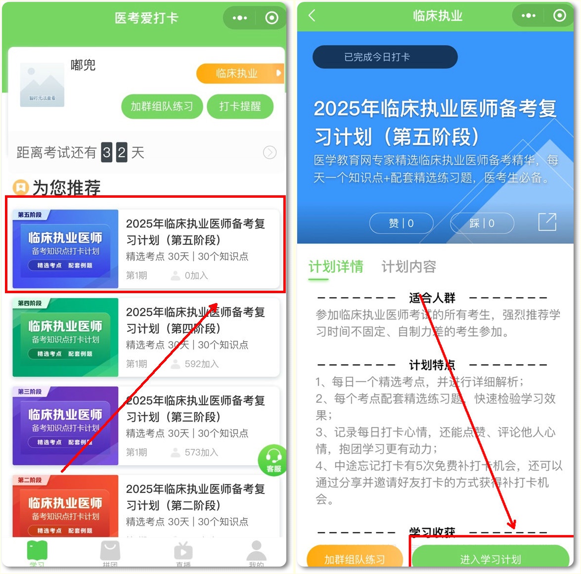 請選擇“您的備考計劃”,如臨床執(zhí)業(yè)醫(yī)師備考復習計劃(第五階段),然后點擊下方“加入計劃開始學習”按鈕,開始正式進入打卡學習;